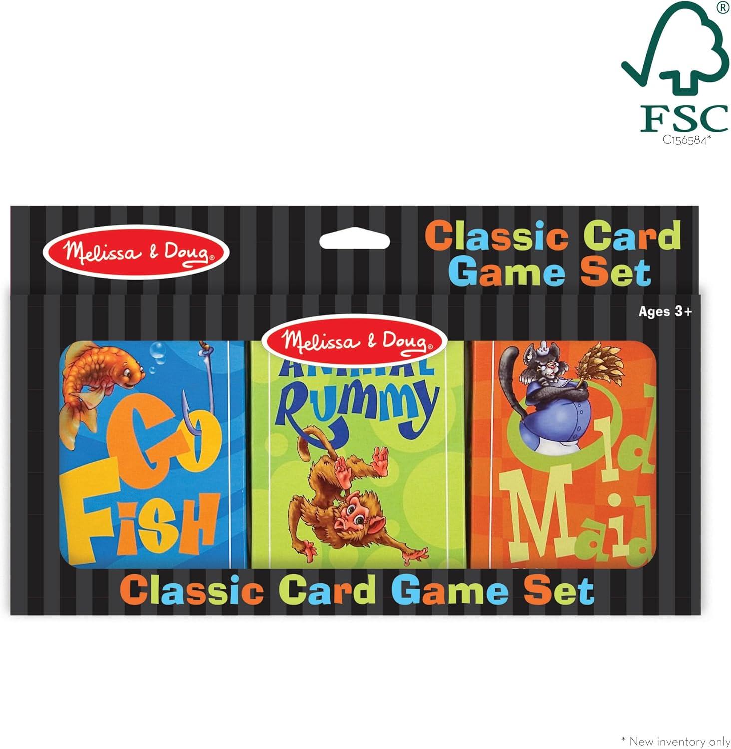 Kids love playing card games and they will go “wild” for this card set! The set includes three complete decks of classic card games including Old Maid, Go Fish, and Animal Rummy. Each deck of cards features humorous and colorful animal illustrations and two of the games feature words to match the pictures. The three-card set comes in a convenient cardboard box for easy storage, and includes detailed instructions. The extra large cards are sized for smaller hands, and they're made from high-quality, durable materials. Don't worry about little messes because the cards feature a surface that's easy to wipe clean. These quick-playing card games are a fun way to get the whole family together, or as a travel game to keep your kids entertained while on the go. The Melissa & Doug Classic Card Game Set makes a great gift for kids ages three and older for hands-on, screen-free play. This product is certified by the Forest Stewardship Council. FSC certification ensures that products come from responsibly managed forests that provide environmental, social, and economic benefits, and that forests are protected for future generations. Please note that FSC certification applies to new inventory only (FSC C156584)
