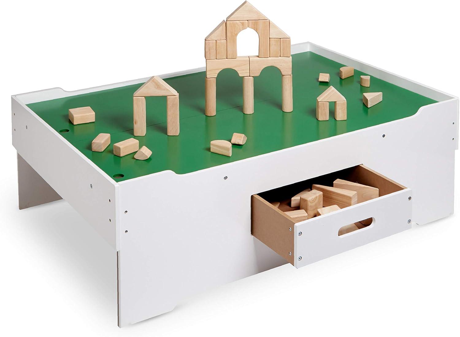 Sturdy wooden panels are ideal for train sets, arts and crafts, dollhouses, block play, puzzles, and more (toys shown are not included with table)