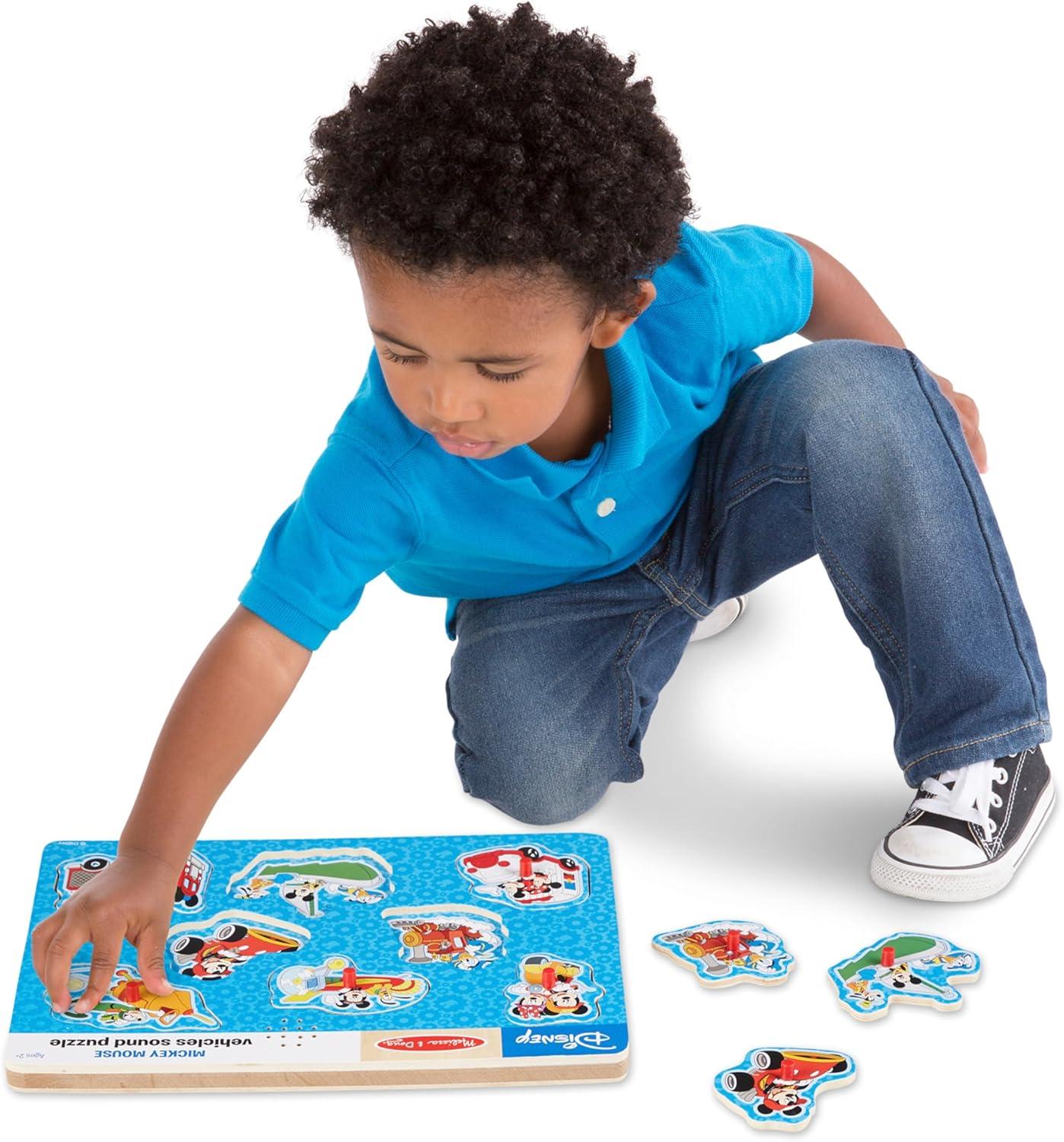 Mickey Mouse Sound Puzzle Fun – 8-piece wooden peg puzzle Bullet Points Mickey Mouse & Friends and plays vehicle or animal sounds when pieces are correctly placed (2 AAA batteries required, not included).