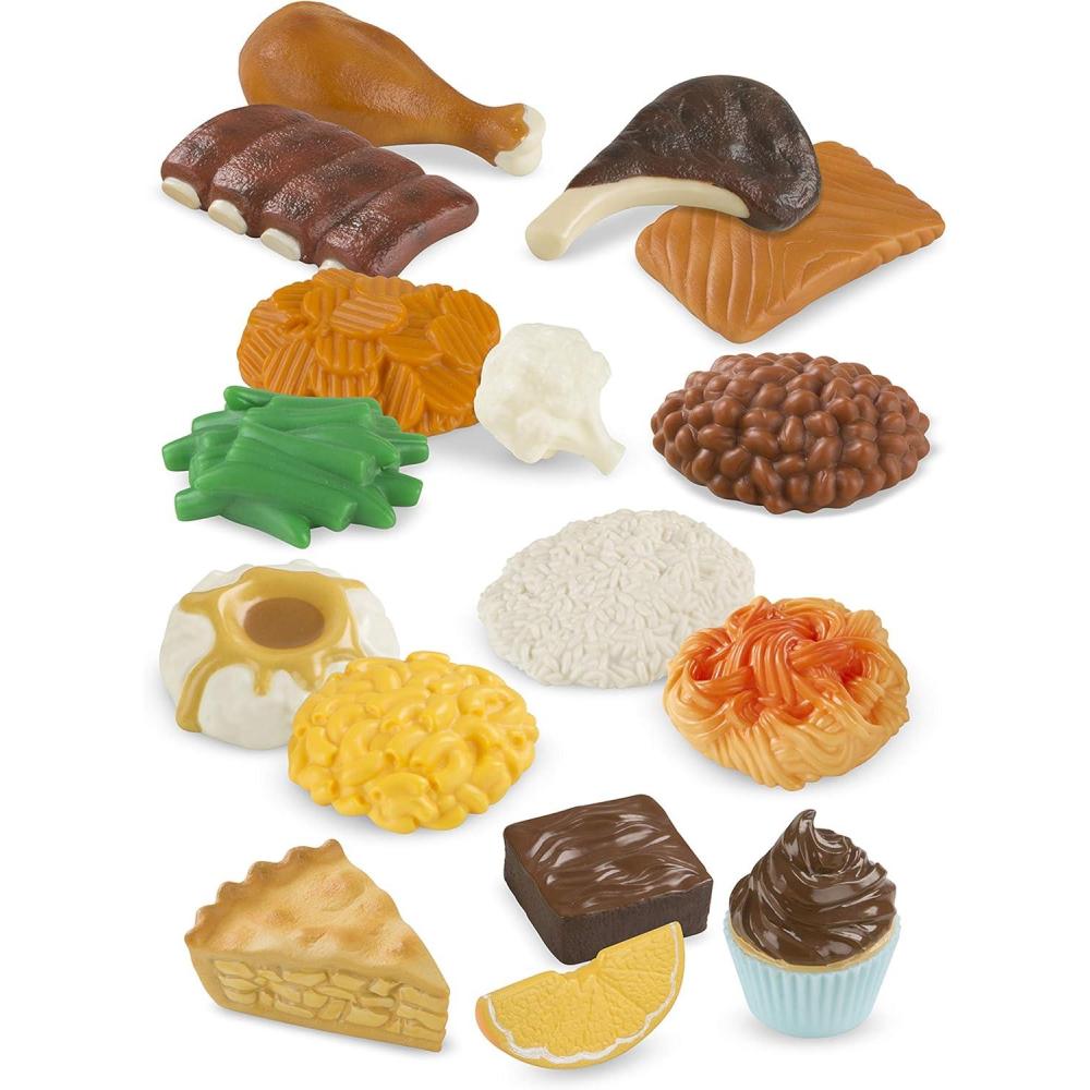 Satisfy hungry imaginations with this 17-piece set of durable realistic play food! Kids three and older will make memorable make-believe meals with the solid, realistically detailed food pieces, while also learning about nutrition and the importance of making and eating balanced meals. This Combine & Dine set includes proteins (BBQ ribs, chicken drumstick, lamb chops, salmon), vegetables and beans (baked beans, cauliflower, green beans, carrots), grains and starches (macaroni and cheese, mashed potatoes, rice), and fruit and desserts (cupcake, orange, brownie, apple pie). Identify the pieces and order meal combos with the reusable, full-color menu card. This playful food set combines perfectly with other Food Fun collections to serve well-balanced fun!