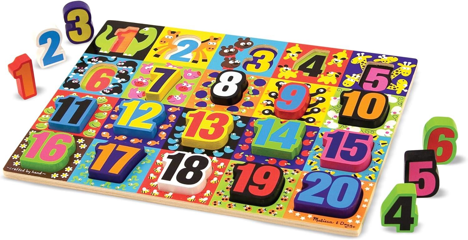 Counting fun begins with this extra thick wooden puzzle that includes 20 easy-grasp, chunky pieces (1-20). A full-color, matching number appears under each piece, and counting pictures equal to each numbered piece are shown on the puzzle board. Number pieces stand up. Encourages eye-hand coordination, fine motor skills, and early math skills. For more than 30 years, Melissa & Doug has created beautifully designed imagination- and creativity-sparking products that NBC News called “the gold standard in early childhood play.” Today, Melissa & Doug is proudly partnering with the American Academy of Pediatrics to foster early brain development and help children build important life skills through play.