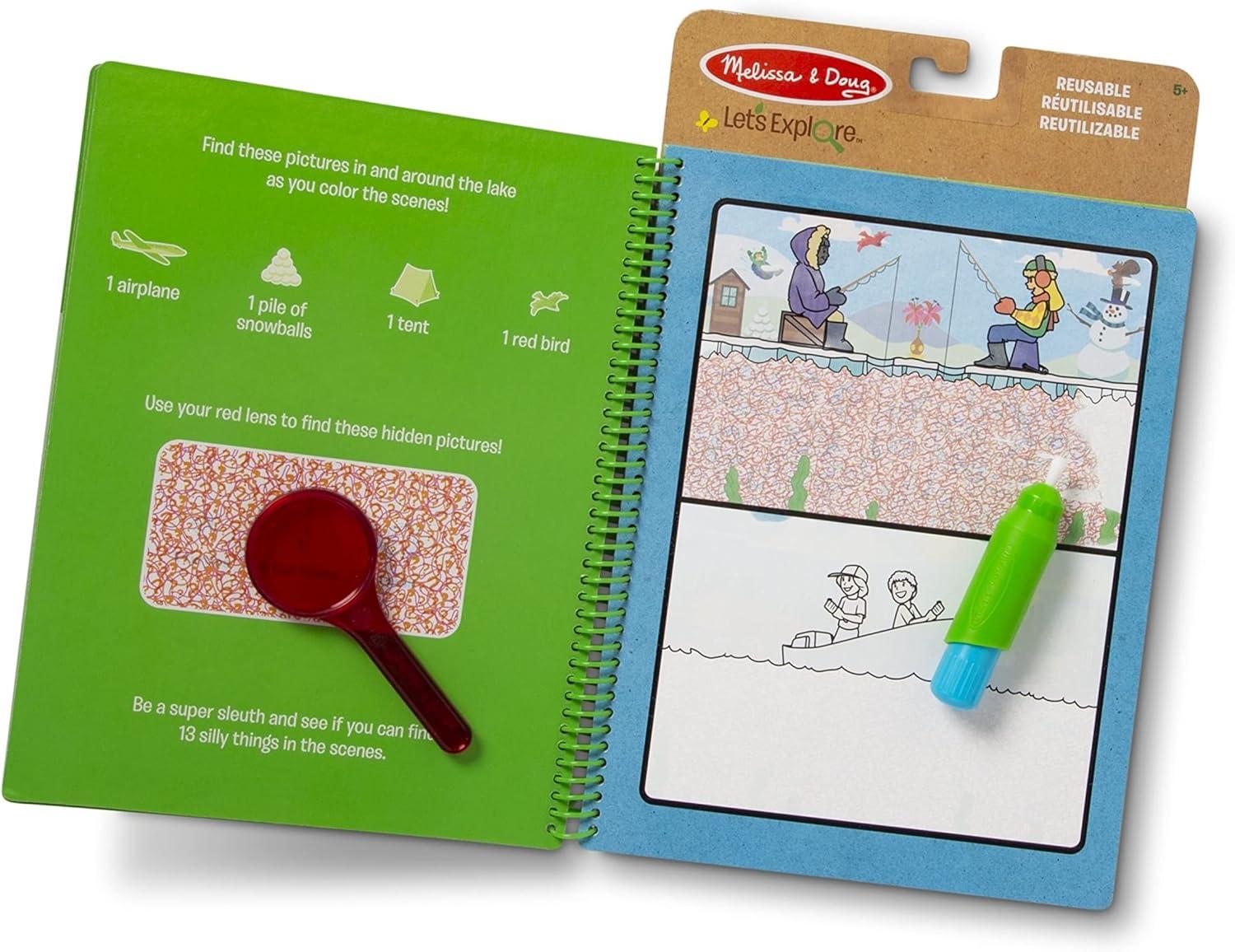 Explore outdoor scenes and adventures with the Melissa & Doug Let’s Explore™ Water Wow! Outdoor Adventure Deluxe Water Reveal Pad! The exciting no-mess paint-with-water activity for kids five and older includes eight spiral-bound reusable pages (rafting, forest maze, camping, underwater, ranch maze, mountain climbing, fishing, hiking trail), a refillable water pen, and a red lens to find hidden pictures, including silly seek-and-find on every scene. Simply use the pen to color in each scene and details and vibrant color appear with every stroke! Use the red lens to discover even more. Then, let the page dry to erase the pictures and color it in again and again. The chunky water pen and red lens store in the cover for easy portability. Let’s Explore™ encourages kids four and older to connect with the natural world through imaginative play. Discover the joy of outdoor adventures that instill curiosity and confidence while inspiring kids to say, “Let’s Explore™”!