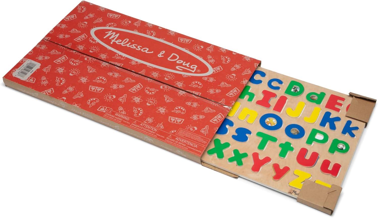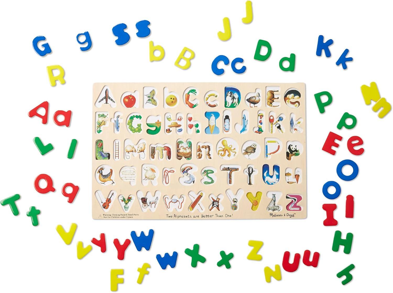 At last! A wooden alphabet puzzle that has upper- and lowercase versions of each letter. Pictures under the 52 brightly colored pieces help kids four and older develop word, letter, and sound recognition. Match the letters on the 18-inch by 12-inch sturdy wooden puzzle board or use the letters separately for sorting, spelling, color-matching, and tracing. No matter how kids play with it, this puzzle spells fun!