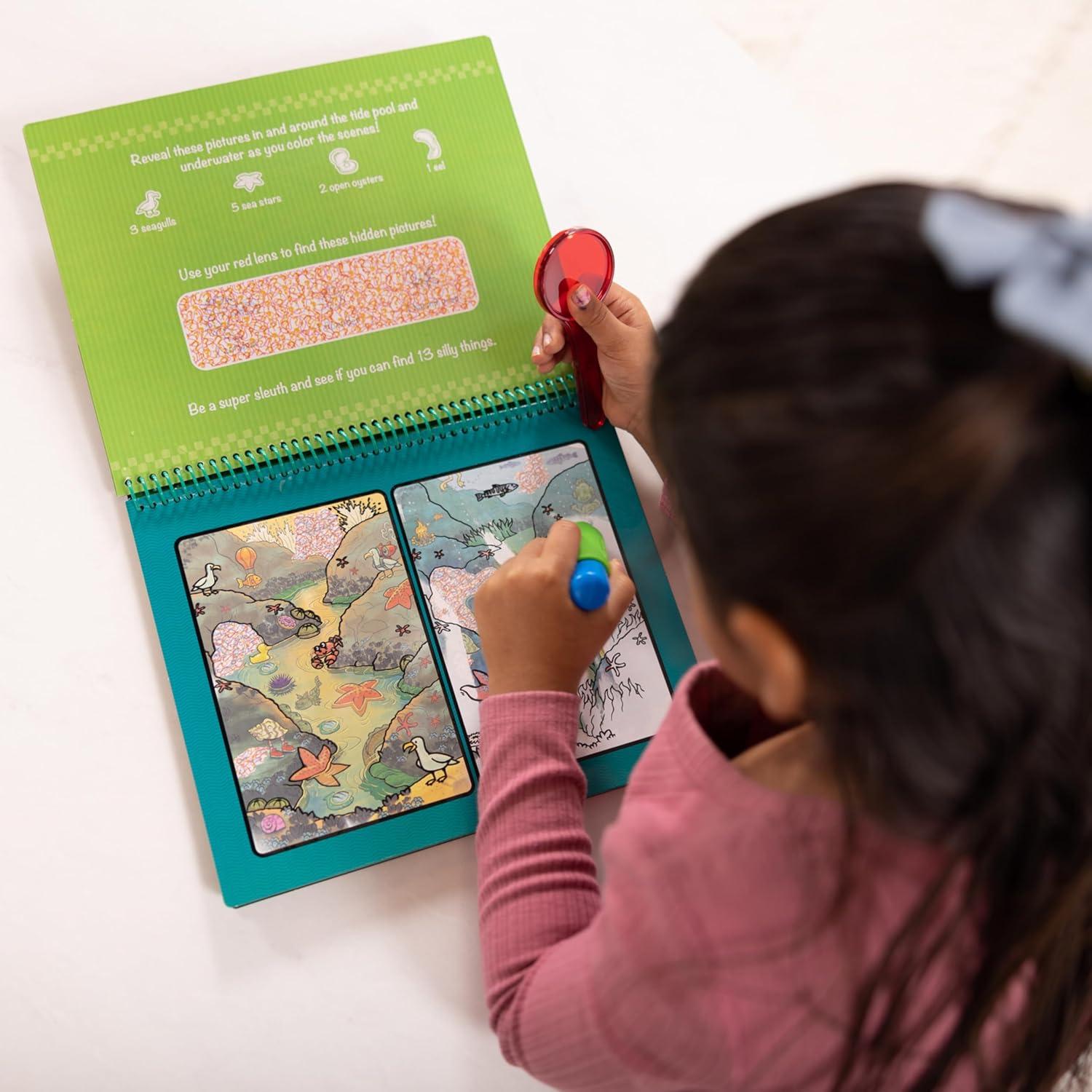 Reusable pages (8 in each) are white with simple line drawings when dry; reveal colors when wet; use red lens to seek and find