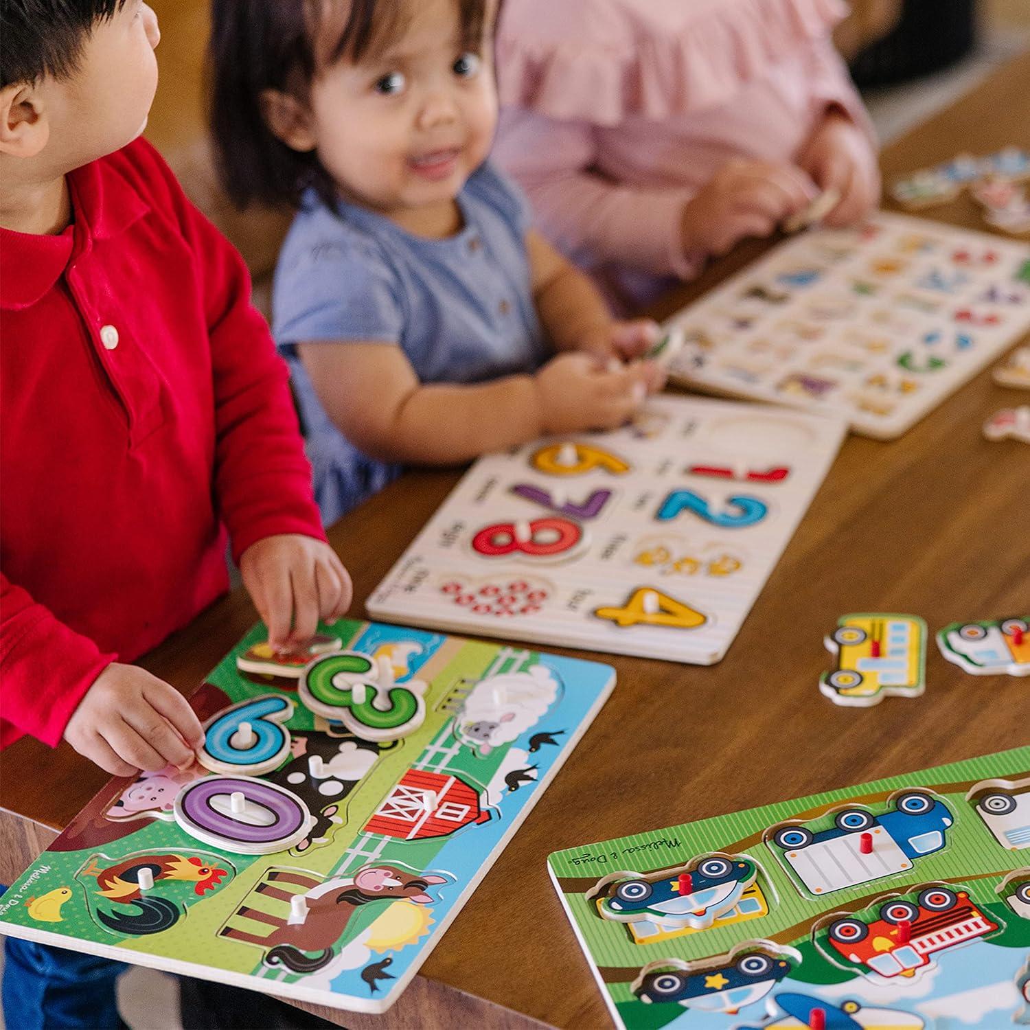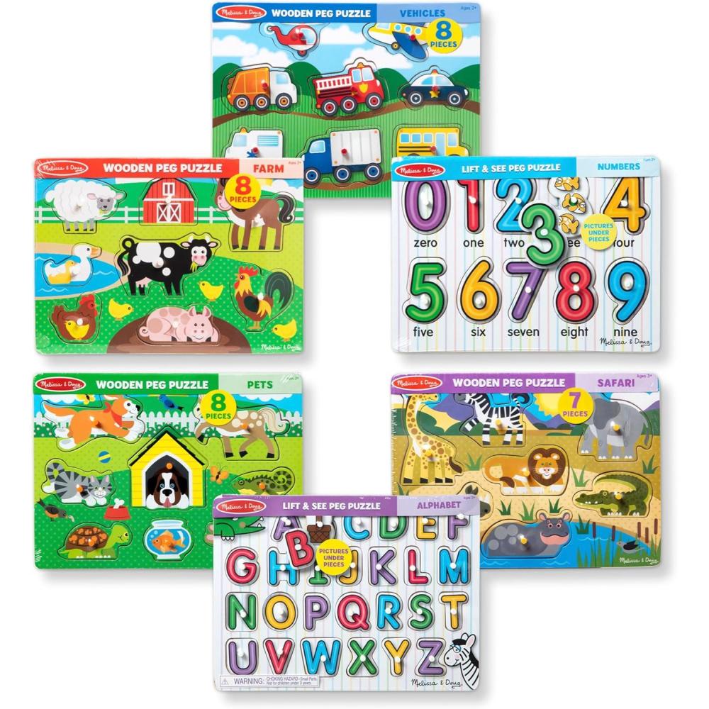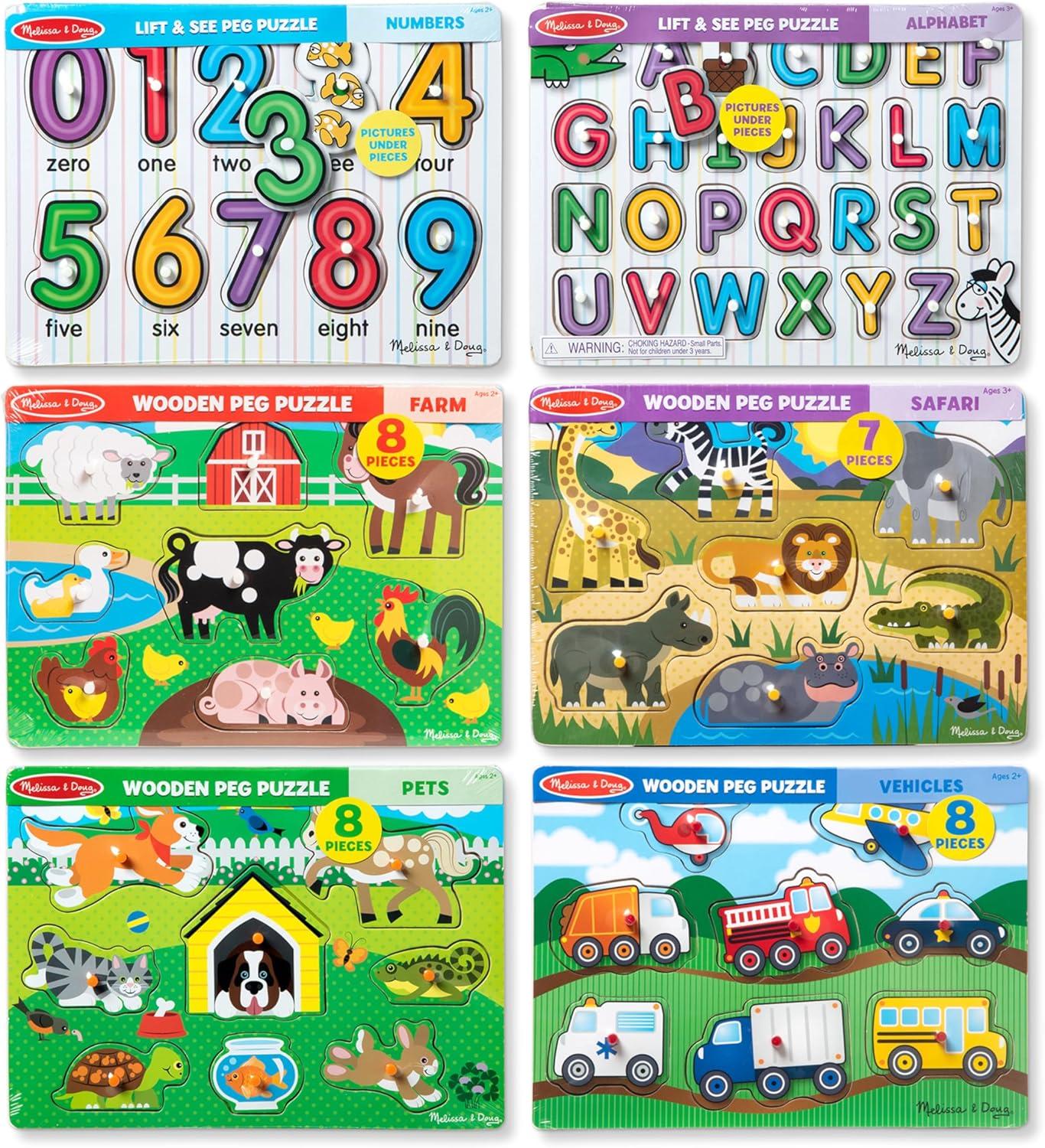 Melissa & Doug Wooden Peg Puzzle 6 Pack Numbers, Letters, Animals, Vehicles