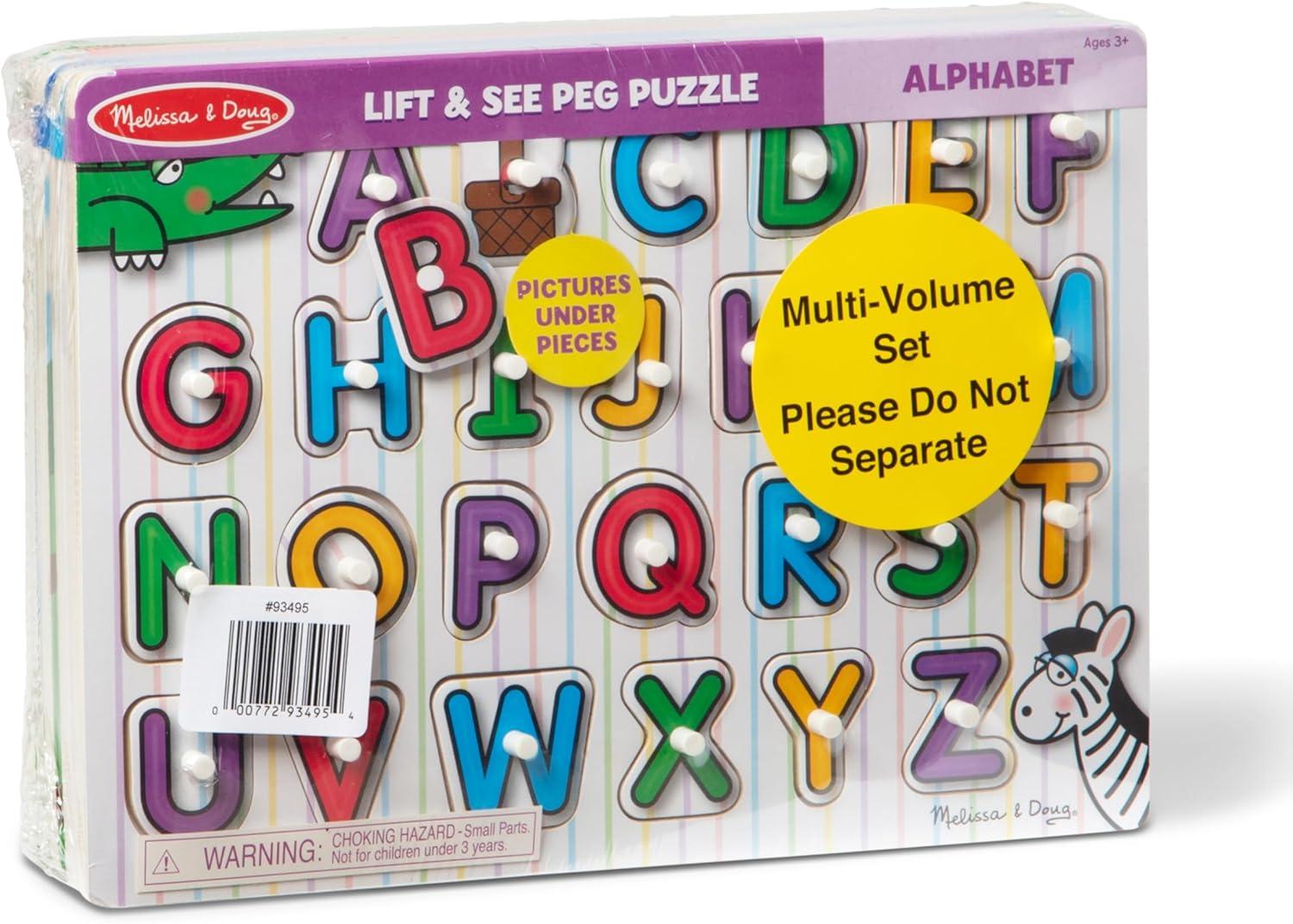 Grab on to this exciting assortment of early-learning, super fun wooden peg puzzles. The set of six includes See-Inside Numbers, See-Inside Alphabet, Farm, Pets, Safari, and Vehicles. Easy-grasp pegs and pictures under the sturdy wooden pieces help kids solve these simple seven- to 26-piece puzzles, which are a great way to practice hand-eye, fine motor and memory skills.